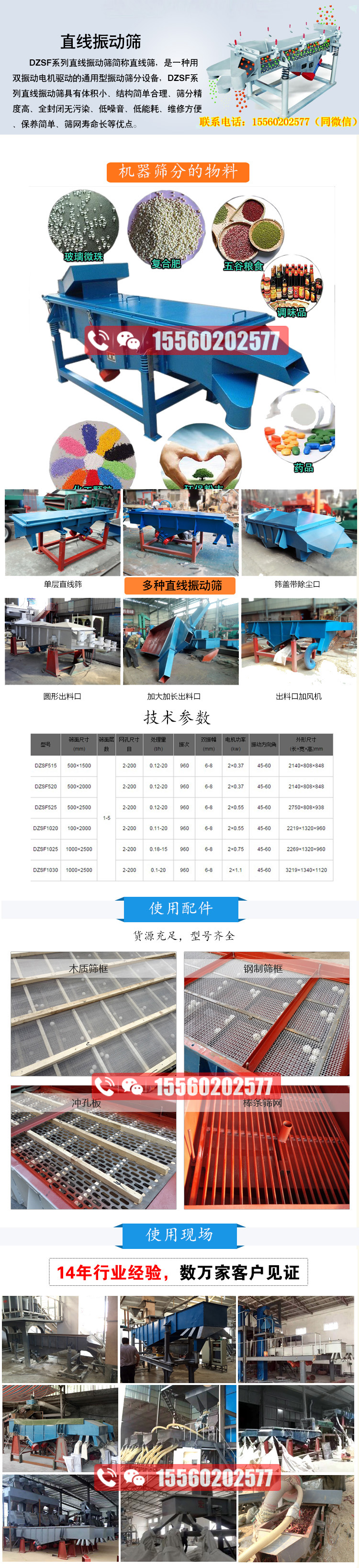 【產品簡介】DZSF直線振動篩是由機架、機體、篩框、篩網、清網球、電機等配件組成,一般使用在化工行業的比較多,比如說:河沙、石灰、石子等,糧食行業也可以使用,比如說:綠豆、黃豆、麥糠等都可以篩分。這臺機器的主要功能是大小分級、篩分, DZSF系列直線振動篩具有體積小、結構簡單合理、篩分精度高、全封閉無污染、低噪音、低能耗、維修方便、保養簡單、篩網壽命長等優點??蓡螌踊蚨鄬邮褂茫疃嗫蛇_到五層,篩框一般為木制結構,若篩孔較大,產量較高時篩框可制成鋼質結構,若篩分腐蝕性物料,與物料接觸部分采用不銹鋼制作。電機安裝方式可分